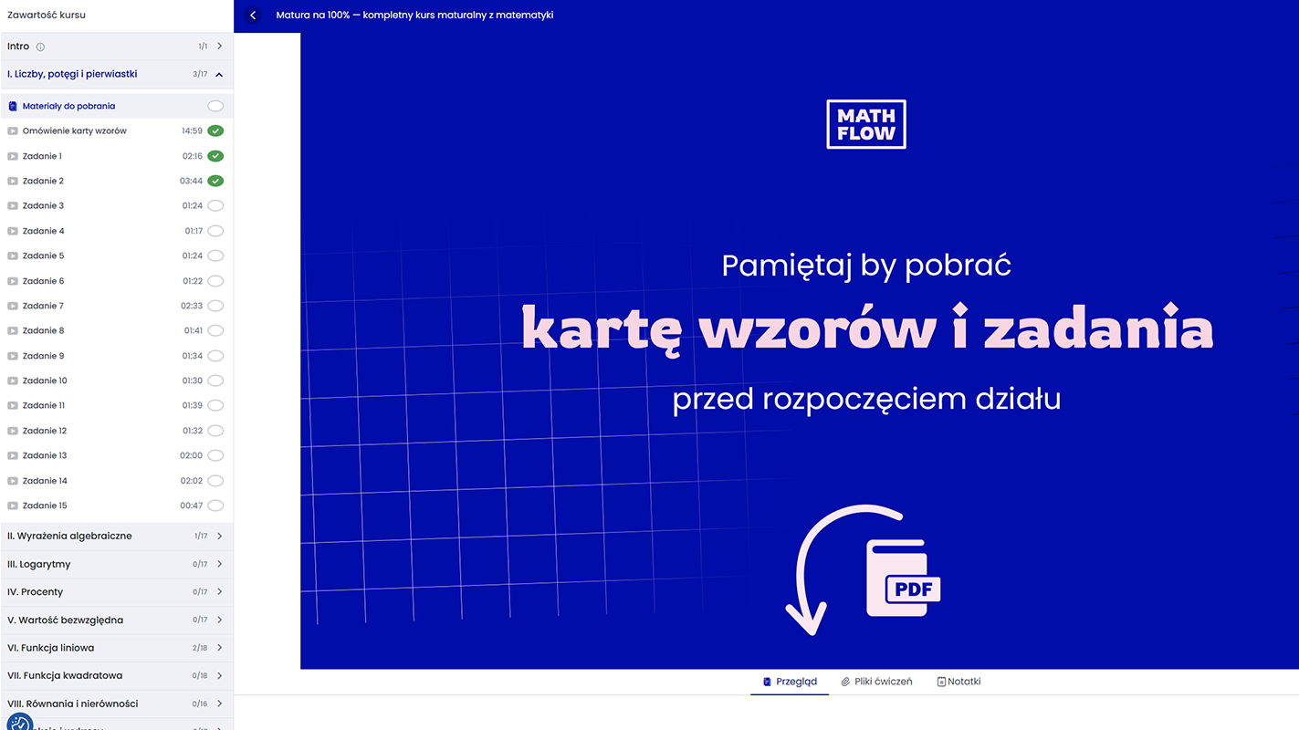 Każdy dział zawiera nagrania na których rozwiązuję i tłumaczę konkretne zadania. Do każdego działu dołączone są karty wzorów i karty zadań, które możesz pobrać, wydrukować i dzięki temu rozwiązywać zadania razem ze mną 🙂